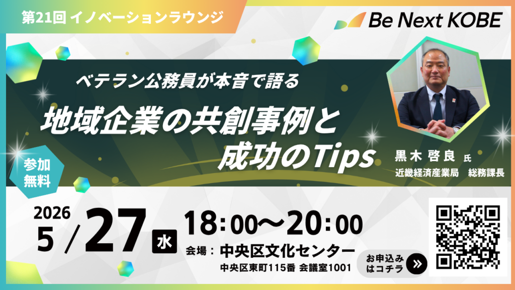 Be Next KOBEは、神戸における挑戦と創造の循環を生み出すことを目的に、企業・行政・個人が交わる共創の場づくりを推進しています。イノベーションラウンジは、その中核となる定期イベントとして、参加者同士の対話と実践を通じた新たな価値創出を目指しています。